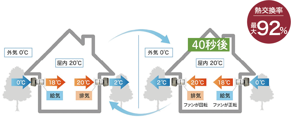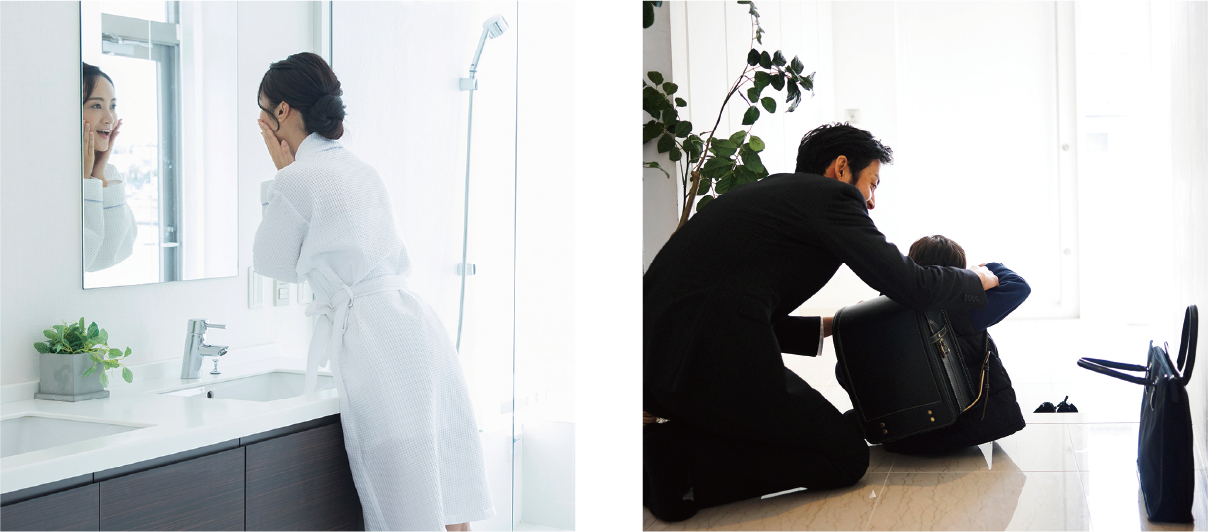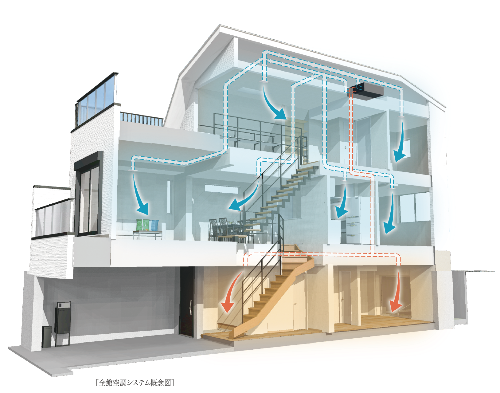 玄関ホールや洗面脱衣室にも冷暖房の空気を送ることで、建物内に温度ムラの少ない快適な環境をつくります。リビングとホールや洗面脱衣室など、場所の温度差を少なくすることで、ヒートショックや熱中症も防ぎ家族の健康を守ります。