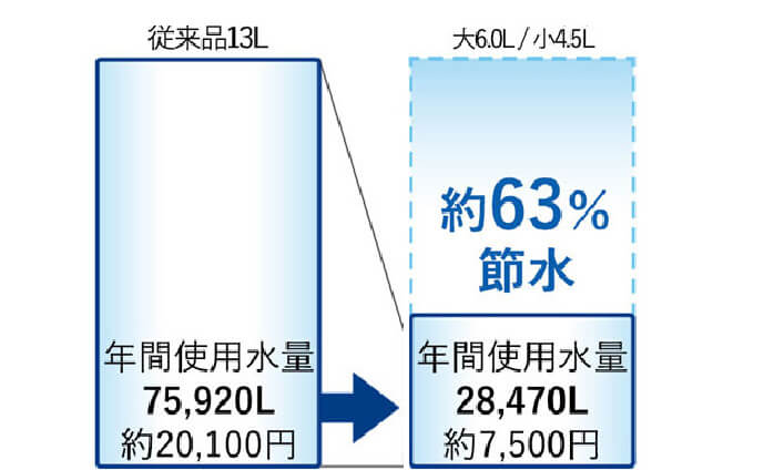 1年でバスタブ約200杯相当を節水。従来の便器よりも洗浄水の使用量をぐんと減らせ、1年の水道料金も最大で約12,600円を節水できます。