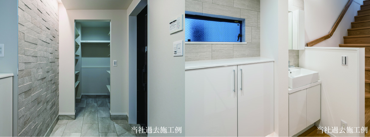 ゆとりの広さを持たせた洗面室では、家族が朝の身支度をしていても、ゆとりを持って洗濯を済ませることができます。またキッチンのすぐそばにあるので動線もスマートです。