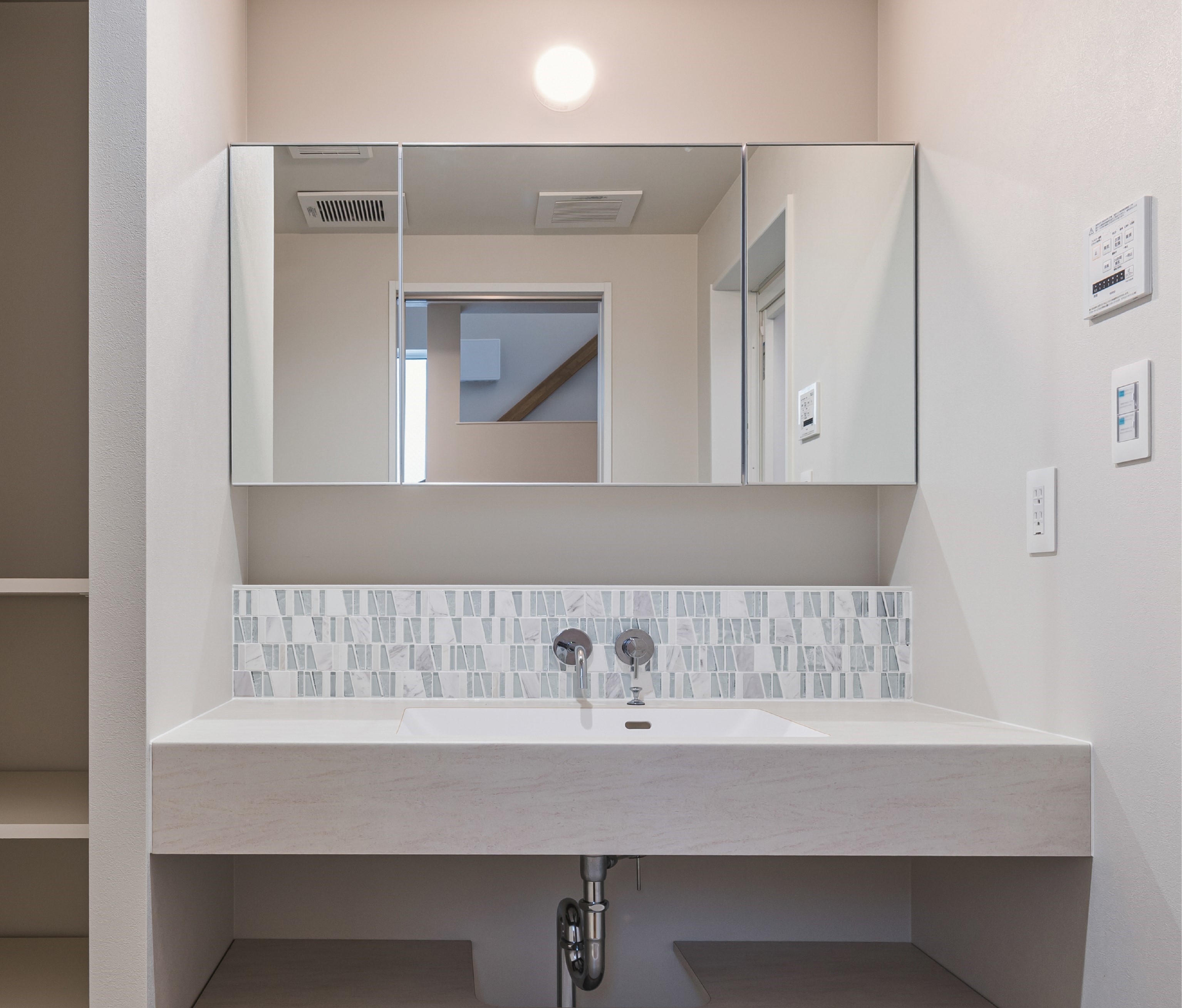 棟ごとにタイルと色の組み合わせが異なる個性豊かな洗面カウンターをご用意。素材とデザインにこだわり、既製品では叶えられないオリジナリティが、遊び心あふれる空間を演出してくれます。