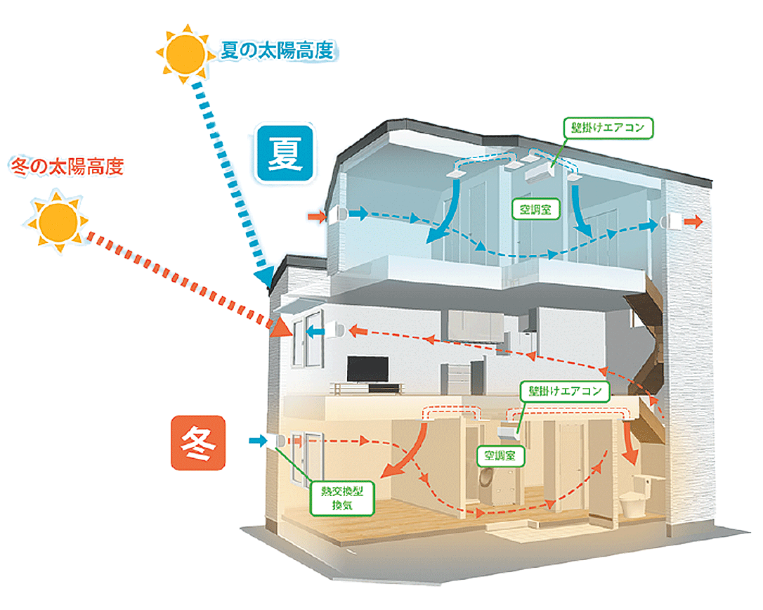 スミカでは、住まう家族の健康に配慮し、家中の空気の流れや温度を整える「全館空調システム」を採用。最低限の機械式空調(エアコン)を自然エネルギー(空気の流れ)として利用し、快適な温熱環境を生み出すパッシブデザインを採用しています。リビング、キッチン、各居室、トイレ、洗面所、浴室に至るまで一年を通して住まい全体の温度差を少なくする、メンテナンス性に優れたルームエアコン式全館空調を取り入れています。