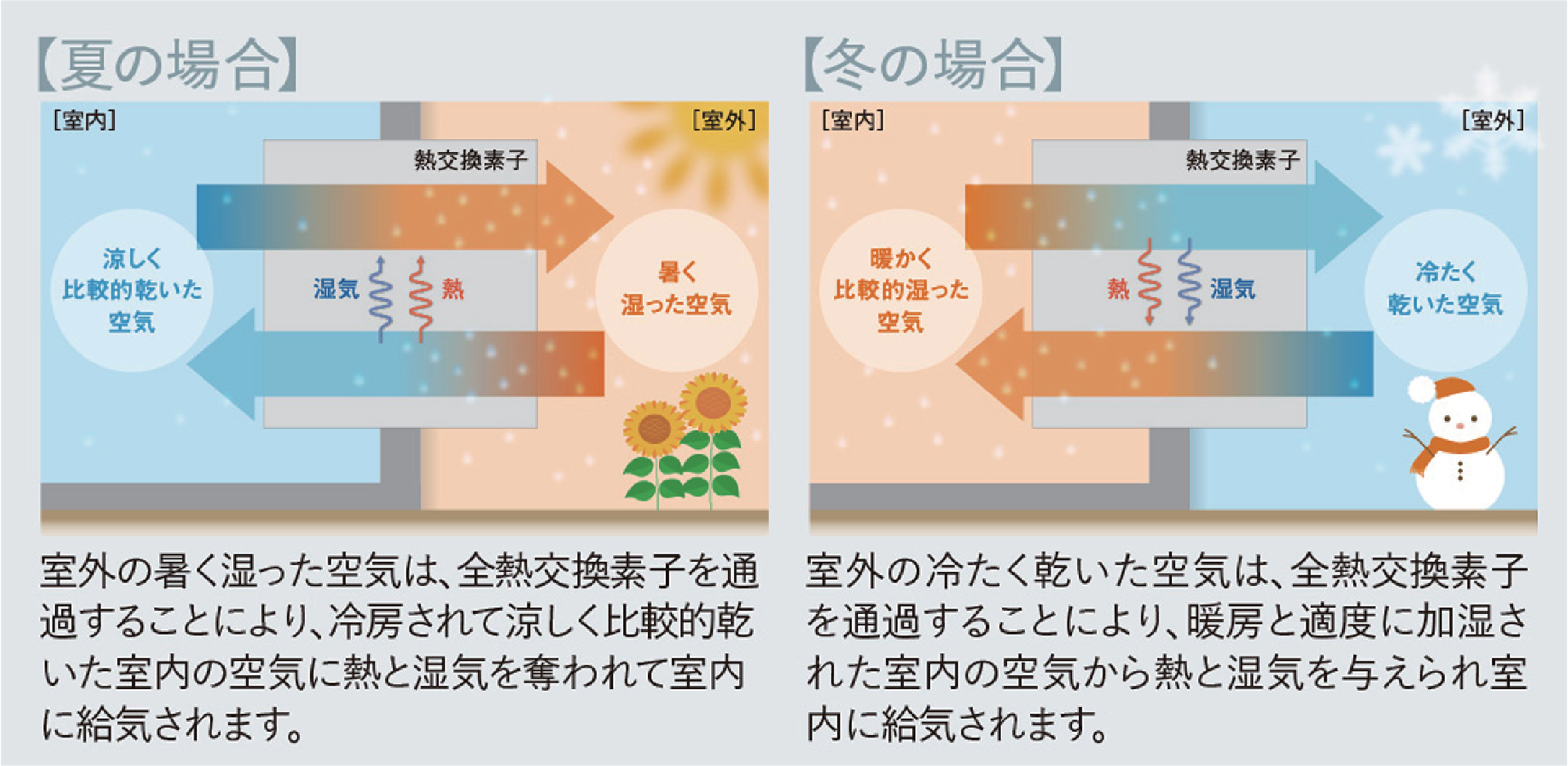 屋外に排気する際、セラミックに温度・湿度を蓄え、室内に給気する際、蓄えた温度・湿度を戻す熱交換機能によって、暖冷房費を削減できます。