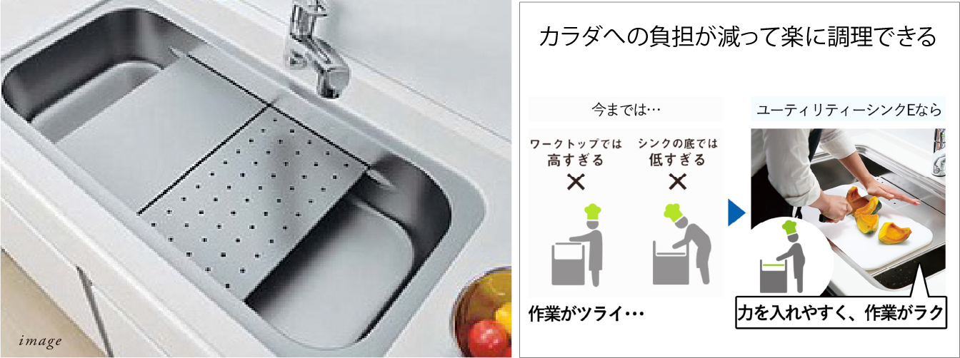 調理がはかどる秘密は3層構造。シンクの上にまな板を置くことができ、野菜くずなどもサッとごみポケットへ。「洗う・切る・捨てる」