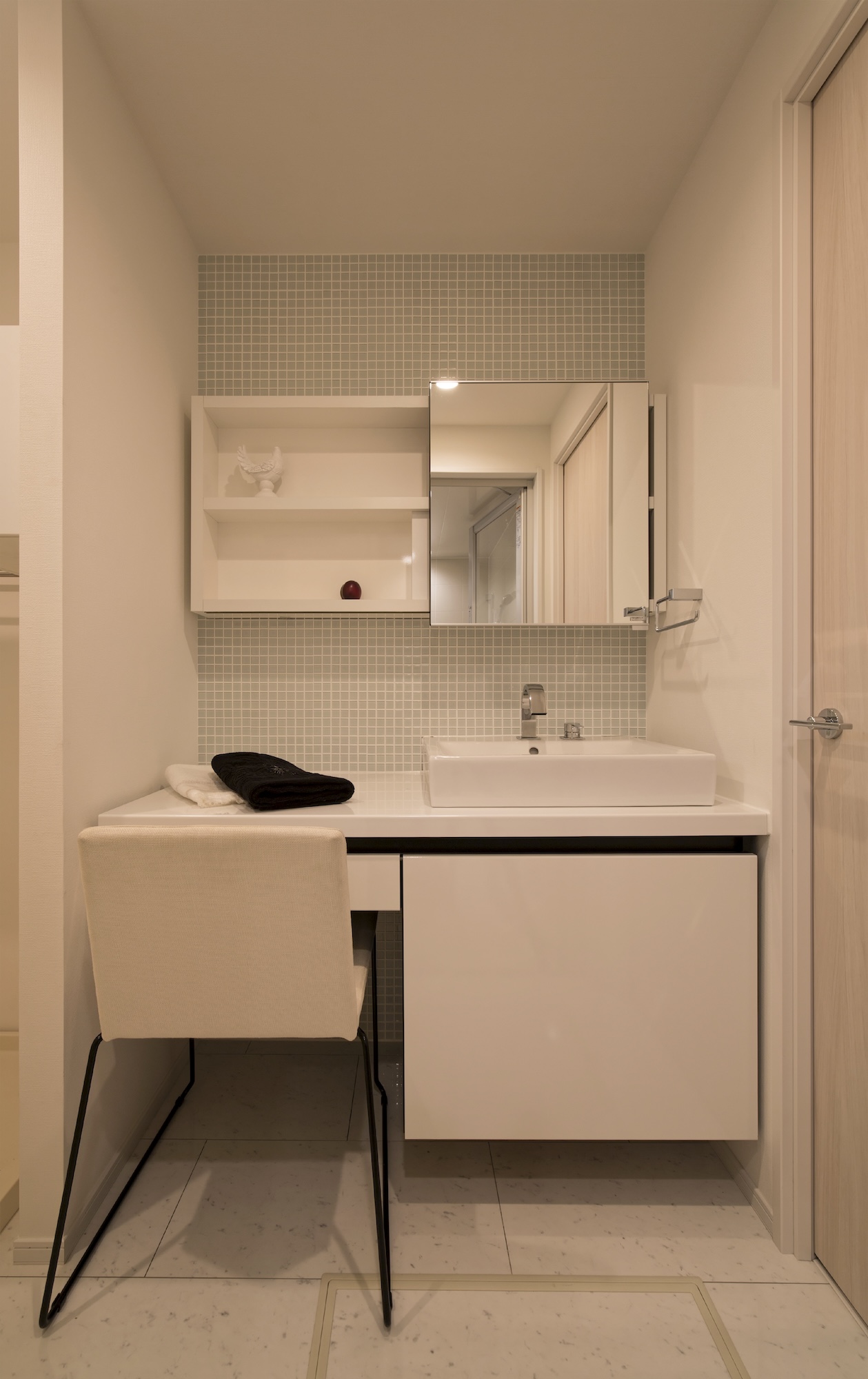座りながら髪を乾かしたり、効率よくヘアメイクをしたり、時短もできるデザイン性と機能を備えたデスクタイプの洗面台。