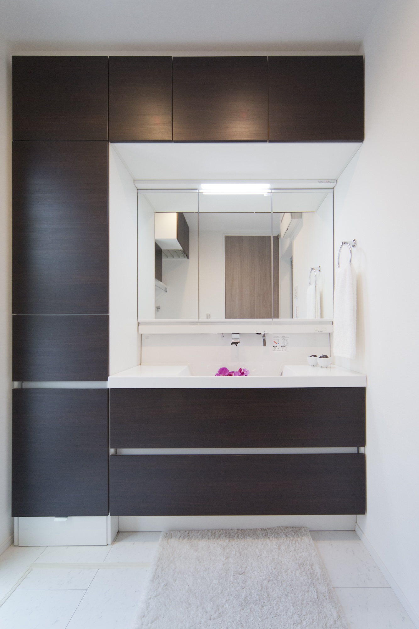 光沢のある木目と天板の高級人工大理石が目を引く、ラグジュアリーな洗面台。