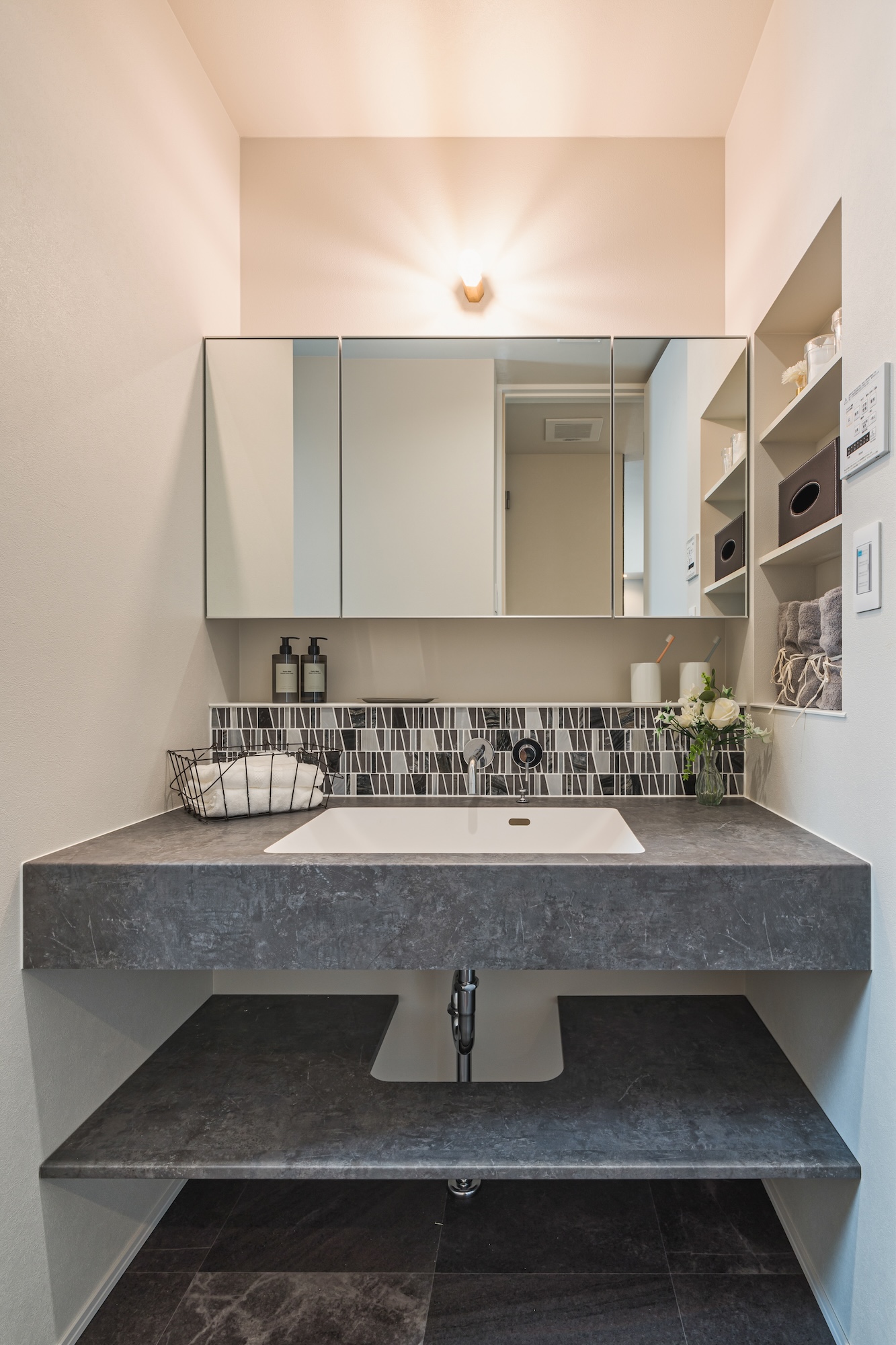 デザイン性の高いタイルと、見せる収納で空間のアクセントになります。