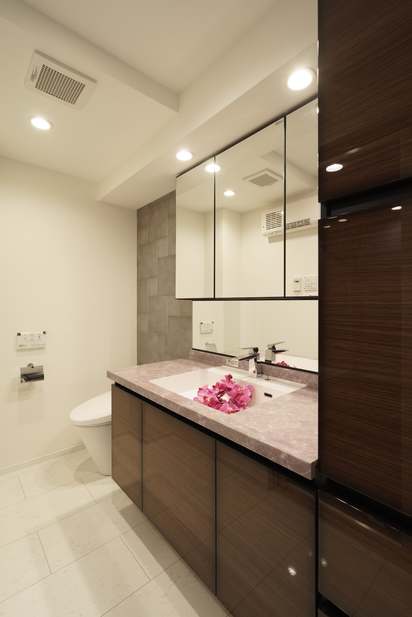 大理石調の洗面台は、パウダールームに重厚感を醸し出します。