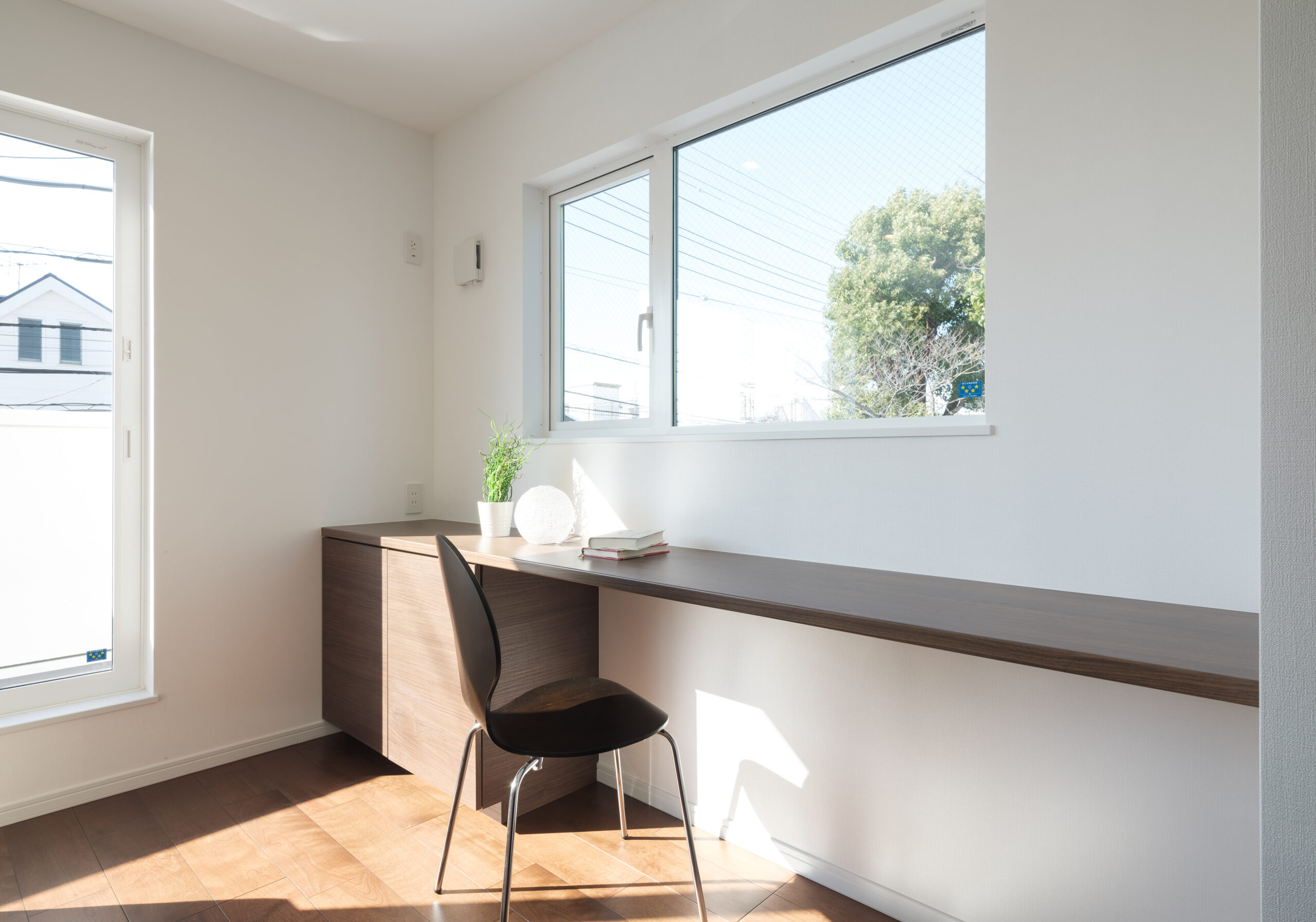 キャビネット付きのカウンターデスクで机の上が常に綺麗。お子様たちが集まり、一緒にお勉強ができるワイドタイプです。窓もあるので気分もリフレッシュします。春には借景による満開の桜が。