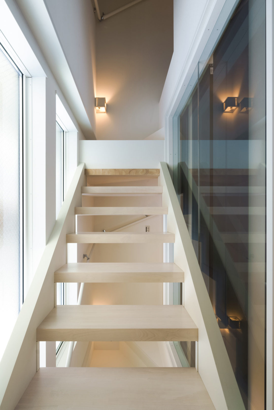 大きな窓から降り注ぐ陽射しの中をアプローチする階段。