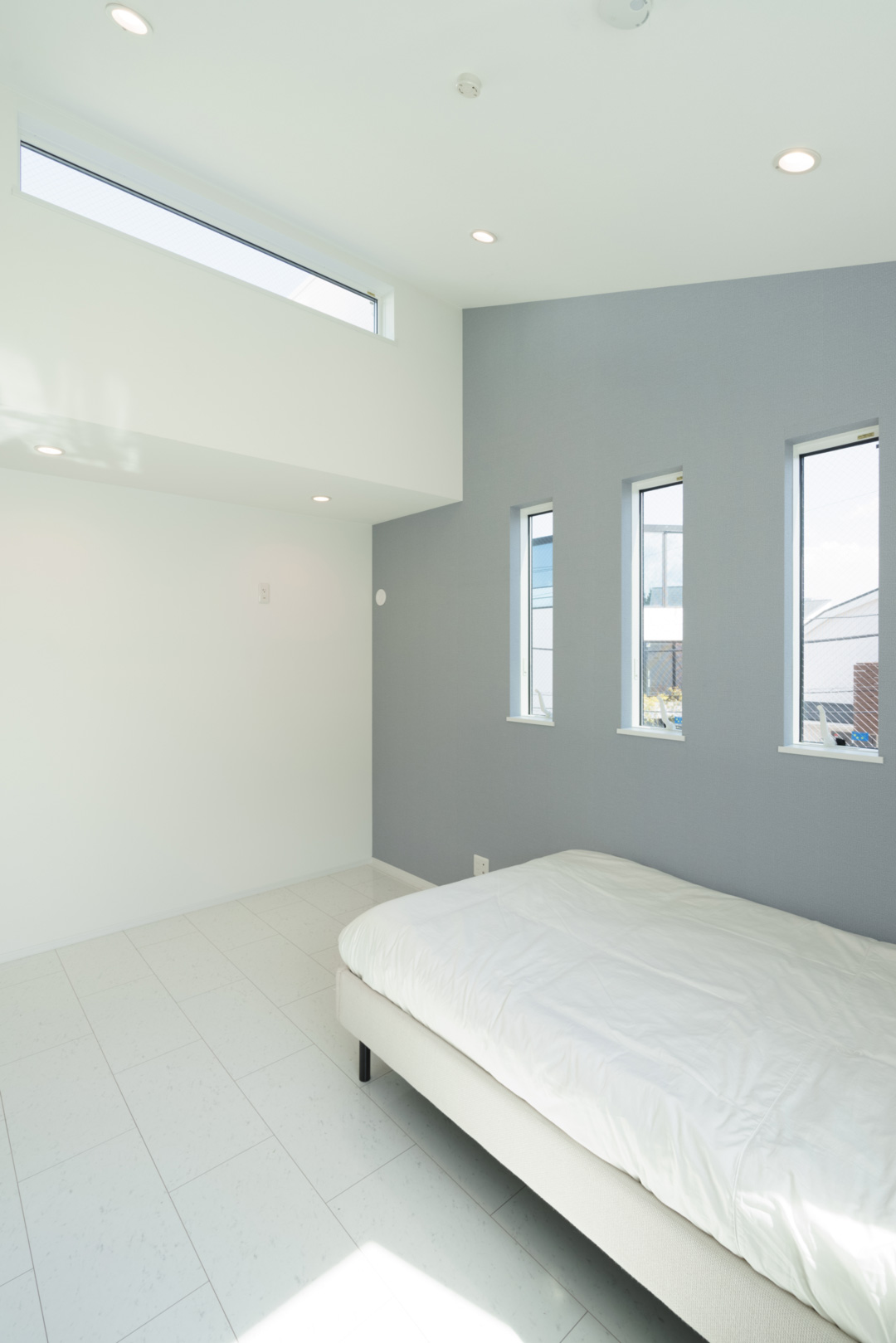 3連の窓や高窓は、陽光を取り込むことはもちろん、内装にも外観にもデザインのアクセントに。また、高い天井で心地よさも追求しました。