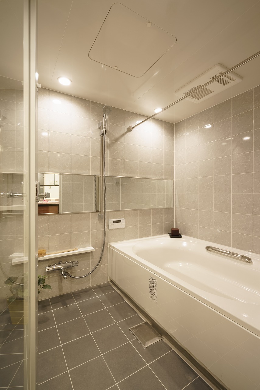 ホテルのようなガラス壁のタイル張りバスルームで寛ぎのバスタイムを。