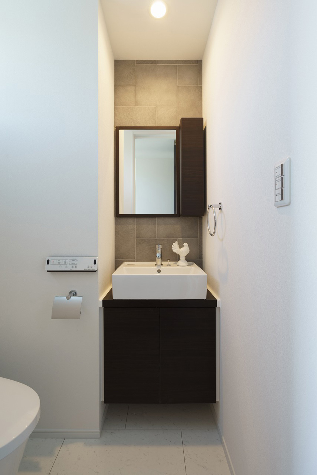 重厚感ある洗面台×トイレは、エコカラットと間接照明の演出でホテルのような空間に。