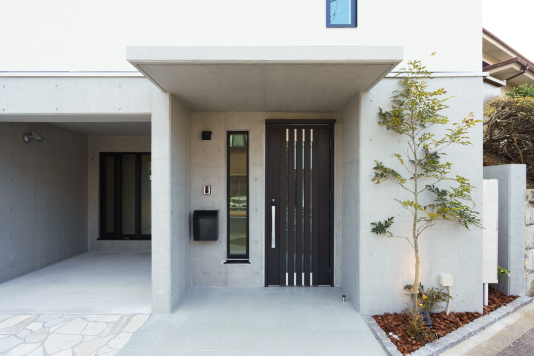 鉄、コンクリート、木材と異なる構造材料を使用した「混構造」を採用し、エントランス周りのコンクリートが特徴的なデザインです。