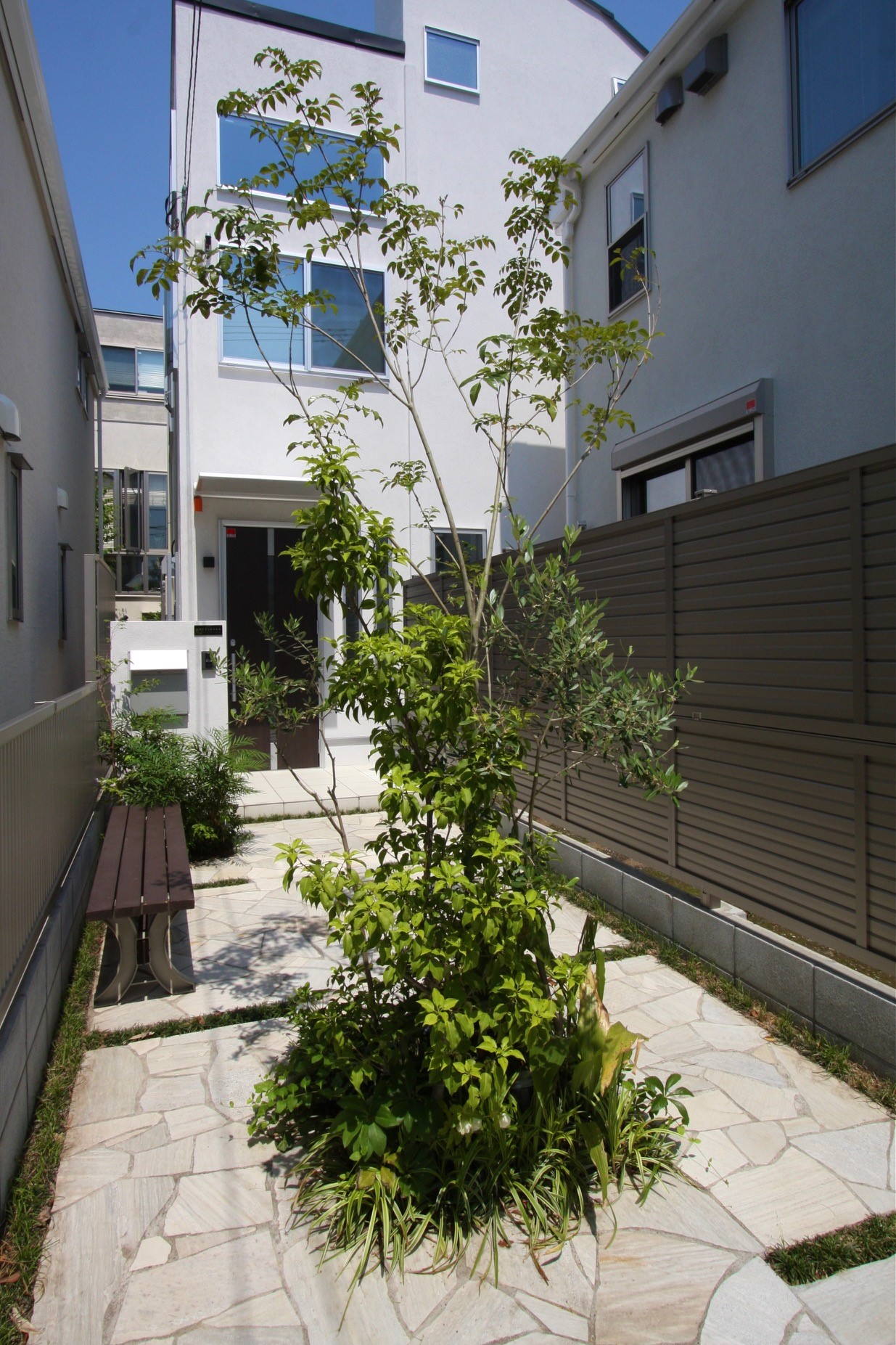 エクステリア中央のシンボルツリーは、デザイン性を高めるだけでなく、目隠し効果も発揮。天気の良い日にはベンチをご用意いただき、読書をしたり、くつろいだり。エントランスにグリーンを配置することで、ご家族の心を癒やします。アンダーカバーには様々な樹種を取り入れ、まるで小さな森林のような空間を演出。見た目はもちろん、木や草花の香りによるフィトンチッド効果も期待できます。