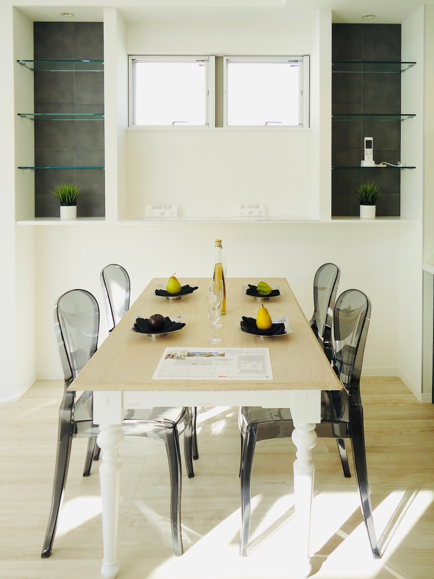 お気に入りの食器などを飾ることができる、間接照明のあるシンメトリーな飾り棚。建具やキッチンに合せたトータルコーディネートで、デザイン性を高める。シンプルながら「らしさ」にも拘った空間で、ご家族での上質な癒しのひと時をお過ごしいただけます。