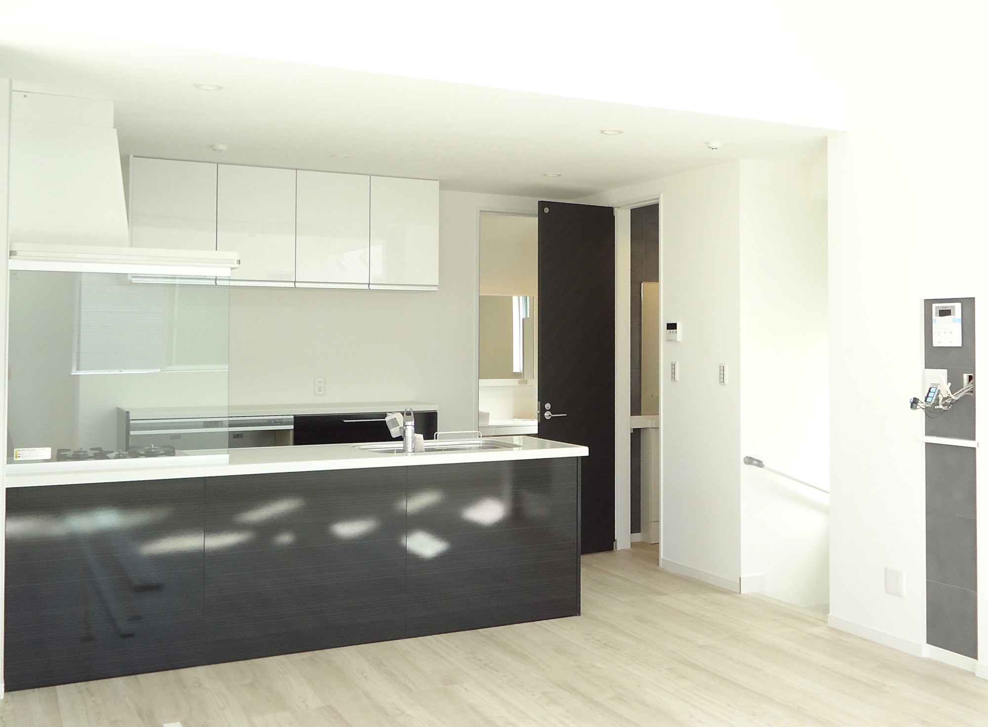 スタイリッシュな形状と使い勝手の良い機能を備えたペニンシュラキッチンです。空間に溶け込むカラーと建具に合せたカラーのトータルコーディネートで、圧迫感を感じないデザイン。素敵なキッチンで心が弾みます。
