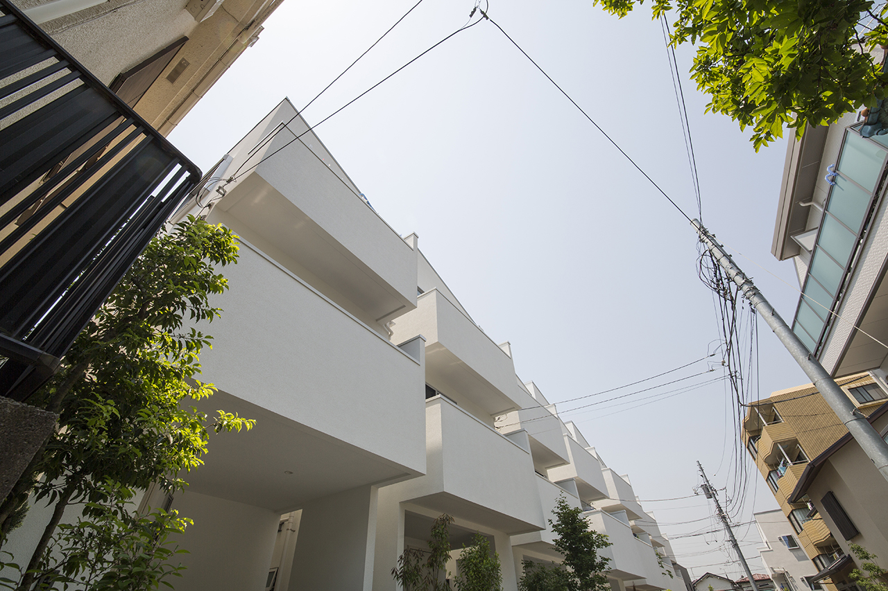 ホワイトの壁と植栽の緑が、清楚でクリーンな印象を与える外観。大型分譲地で、シンプルモダンな建物はインパクトがあります。
