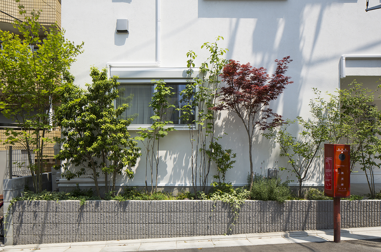 そのような忙しない日常の中でも、緑や土がある心地よい空間を目指しました。白壁の家や塀の周りには、四季の移り変わりを感じる植物を植えて、日々の変化を愉しめるように。